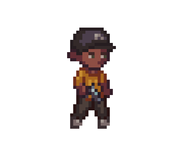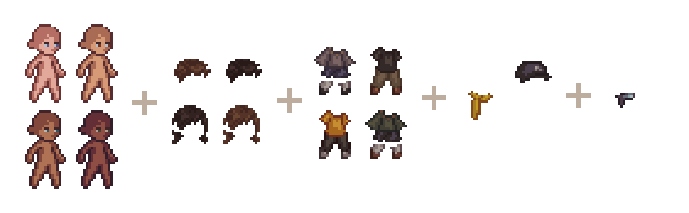 • Separate layers for body (4 skin tones), outfits, accessories (scarf + baseball cap), and pistol